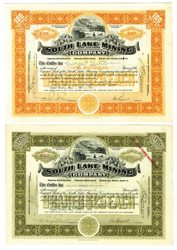 Michigan. Pair of Issued Stock Certificates one for 100 Shares (orange border) and other for 3 Shares (green border). Both have image of snow covered mine at top above company title, VF-XF condition, John A. Lowell BNC.