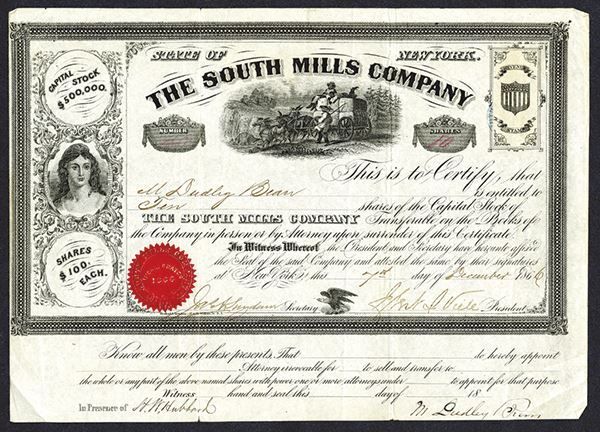 New York, 10 Shares, I/U, Liberty portrait on left, slaves on wagon carrying cotton bales, S/N 40,. Extremely rare and interesting certificate. Horace Greely invested in the company to form an area for freed slaves to own their own land and be able to make a living off the land. The company was supposed to purchase 4 square miles of land in the South. In the end, all that was purchased was a small tract of useless swamp. Historic scam stock certificate with an interesting story.