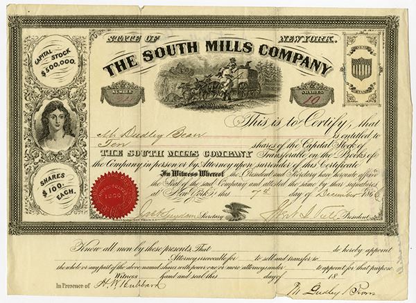 New York, 10 Shares, I/U, Liberty portrait on left, slaves on wagon carrying cotton bales, S/N 34, Extremely rare and interesting certificate. Horace Greely invested in the company to form an area for freed slaves to own their own land and be able to make a living off the land. The company was supposed to purchase 4 square miles of land in the South. In the end, all that was purchased was a small tract of useless swamp. Historic scam stock certificate with an interesting story.