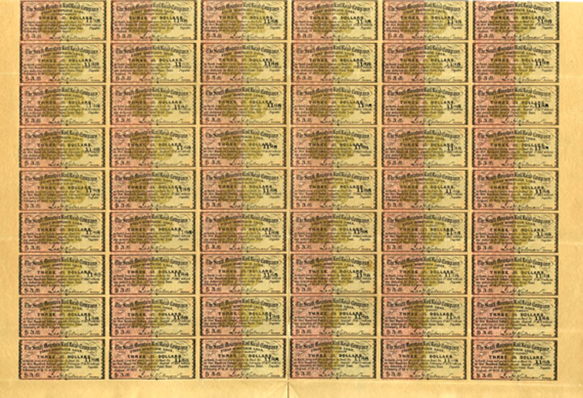 Pennsylvania, 1873. $1000 I/U 7% First Mortgage Gold Coupon Bond, Black text with black border and gold underprint printed on light brown paper on large oversized certificate, Train passing over bridge with men surveying at top center, S/N 1188, Fine to VF+ condition on toned paper. Extremely attractive bond.