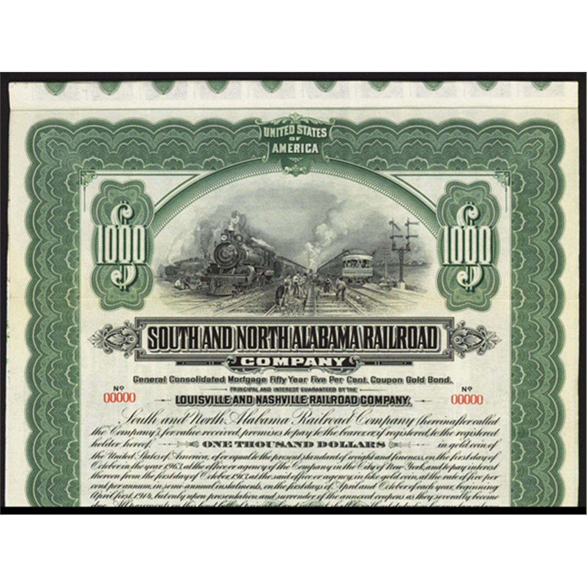 Alabama, 1913, $1000, Specimen bond, Trains and track workers, Green, Coupons attached, ABNC, POC's, minor fold split, otherwise XF.