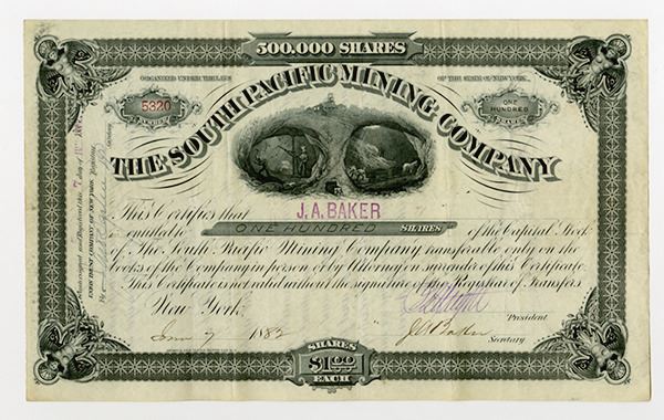 New York, 1882.... 100 Shares I/U Capital Stock Certificate, Black text with ornate black border, no underprint, Scene at center of men drilling and at work in underground mineshaft. Fine condition, Printed by HLBN. Signed by and issued to J.A. Baker, the namesake of Baker, California.