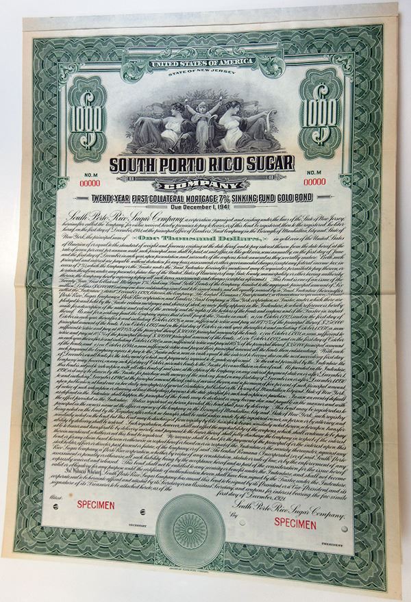 Puerto Rico, (Inc. in New Jersey). $1,000 Specimen 7% 1st Collateral Mortgage Sinking Fund Gold Bond, Black print on green border and under tint, Allegorical women and child at top, Specimen overprints and POC's, Fine-VF condition, ABNC.