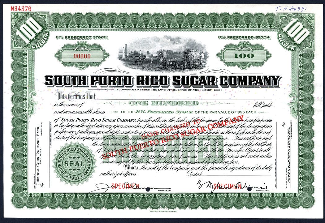 Puerto Rico, 100 Shares, Preferred, Black on green border und underprint, Sugar cane in oxen pulled wagon with sugar factory in background. Overprinted "Name Changed to South Puerto Rico Sugar Company", XF, POC. ABNC.