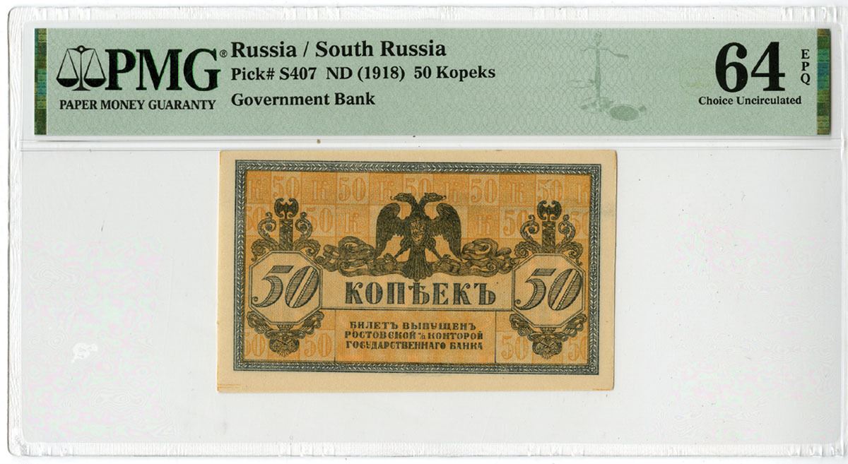 South Russia, Russia. ND (1918). 50 Kopeks, P-S407, Issued banknote, Black on orange underprint, PMG graded Choice Uncirculated 64 EPQ.