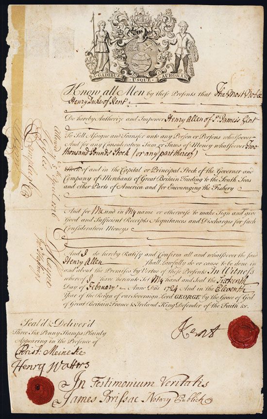 Britain, Feb 16th, 1724, Power of Attorney for selling and transferring capital stock, Printed in black with vignette of company's arms top center, 3 Six Pence stamp imprints top left, 2 Different red wax seals bottom left and right, Fine condition. South Sea Co. was incorporated in 1711 and had exclusive trading right to Spanish South America. Main purpose of the company was to fund the government debt incurred during the War of Spanish Succession. Speculation in the stock then led to the famous South Sea Bubble in 1720. (Sotheby's Lot 592 Date (?)).