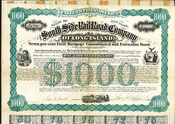 New York. $1000 7% Coupon Bond. Issued. All 80 coupons still attached. Light paper separation at the fold points. A very large format bond. Very Fine. (From the John E. Herzog Collection)