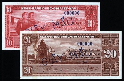 South Viet Nam, ND (1962), Lot of 2 notes, 10 Dong, P-5s, Red, CU to Gem Unc; 20 Dong, P-6s, AU to Uncirculated, both are specimens with "Giay Mau overprints. Scarce and attractive as specimens. SBNC.