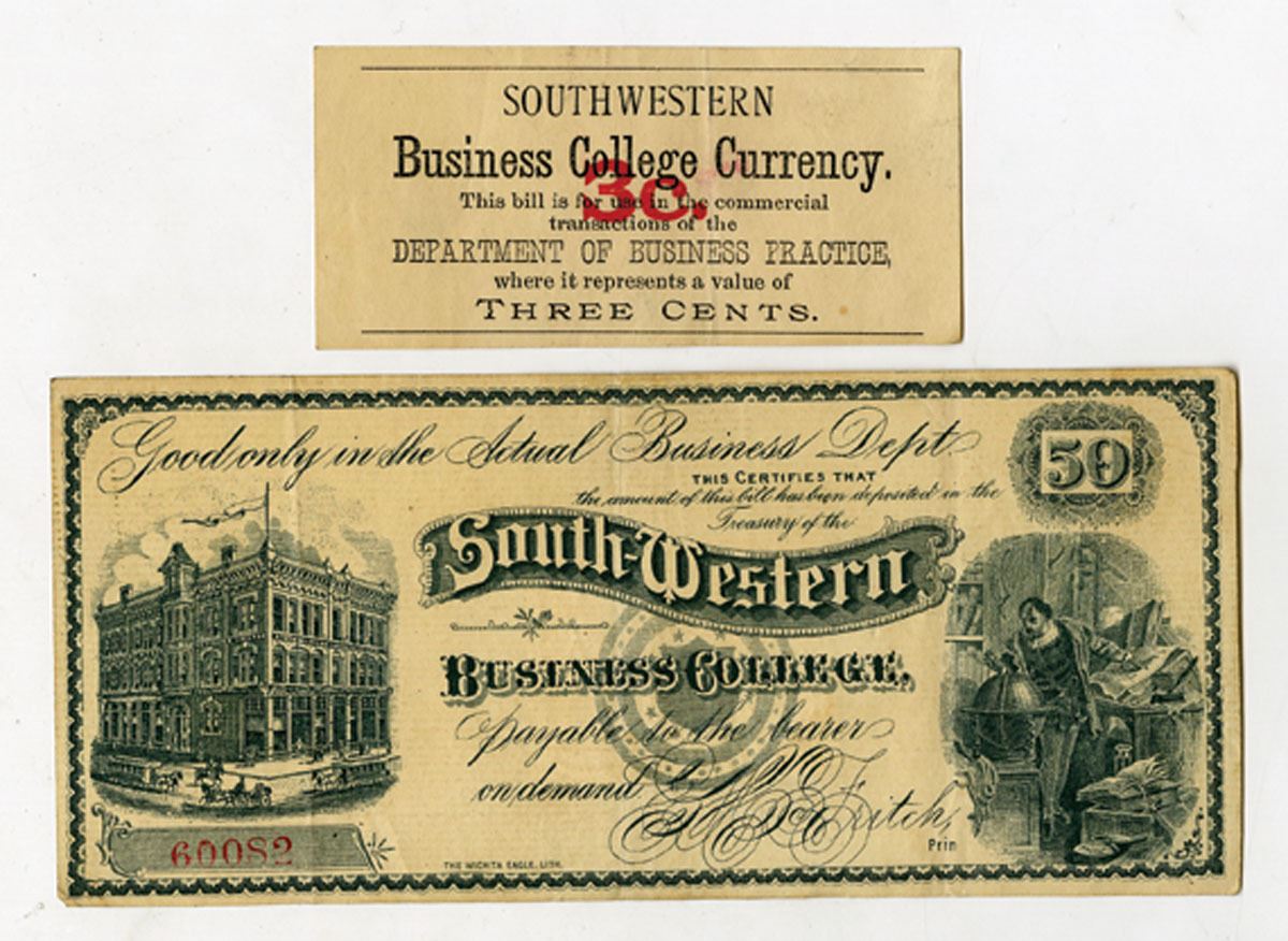 Lot of 2 Banknotes from the Southwestern Business College, Includes 3 Cents Note for use in the commercial transaction of the department of business practice, AU; and, $50 "good in the actual business department". VF condition. (2)