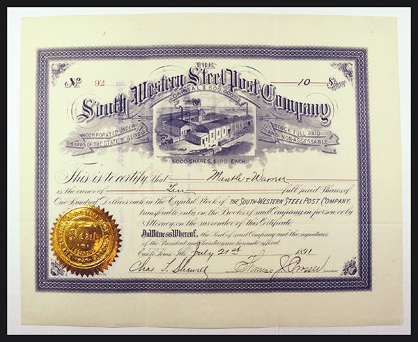 Illinois. 10 Shrs Stock Certificate. Issued. Uncancelled. Along with photocopy of an article and other documents about the Mantle, one of the parties to whom the certificate is issued.