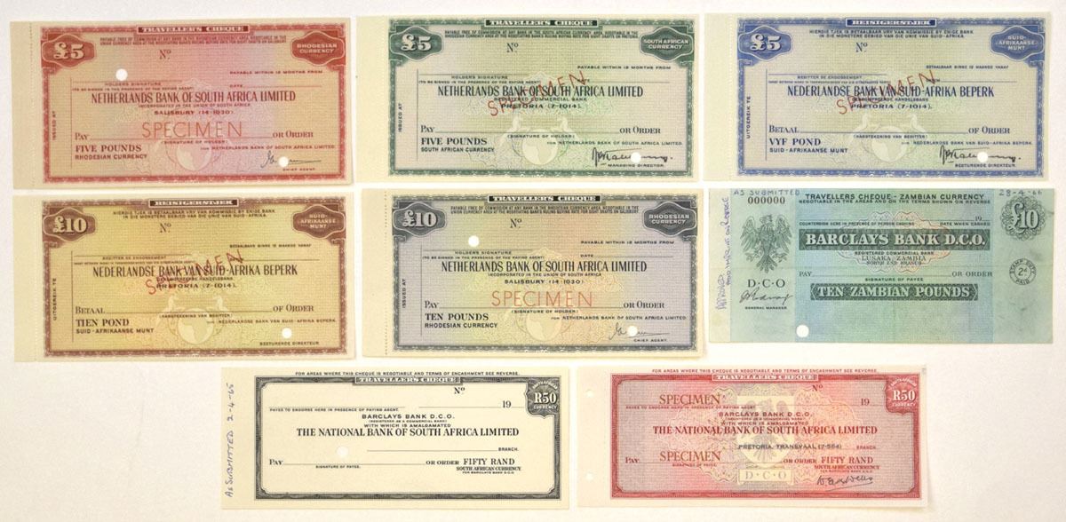 Southern Africa, ND 91960s). Lot of 8 Specimen and Proof Traveler's Checks from Netherland Bank of South Africa Ltd., National Bank of South Africa Ltd., and Barclays Bank, Checks have Specimen overprints and are in AU to UNC condition. (8). Sold "AS IS" no returns accepted.