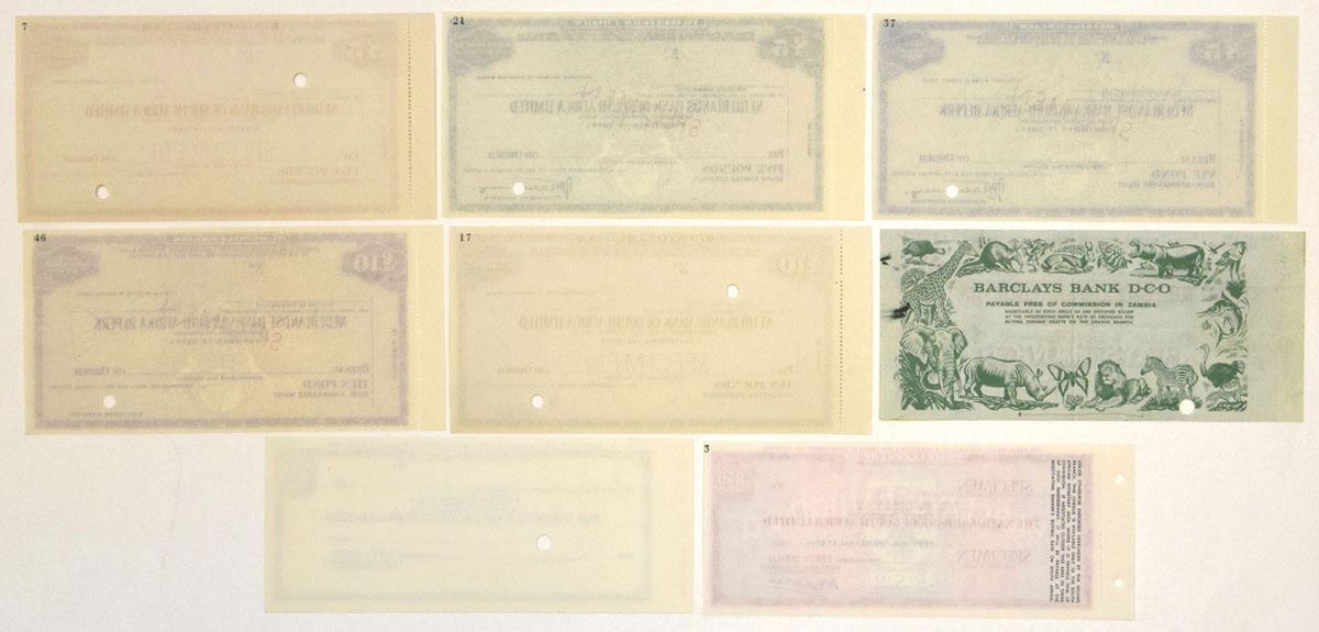 Southern Africa, ND 91960s). Lot of 8 Specimen and Proof Traveler's Checks from Netherland Bank of South Africa Ltd., National Bank of South Africa Ltd., and Barclays Bank, Checks have Specimen overprints and are in AU to UNC condition. (8). Sold "AS IS" no returns accepted.