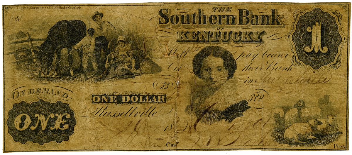 Russellville, KY. $1, Issued obsolete. Young woman in middle Sheep lower right, Family with horse upper left. VG to Almost Fine with reinforcement backing in middle of the back. Appears to be a contemporary counterfeit. TC&C.