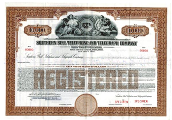 New York. $5,000 Specimen 3% Registered Debenture Bond, Black print on red border and under tint on horizontal format, Allegorical figures at top flanking image of a telephone, Specimen overprints and POC's, VF-XF condition, ABNC.