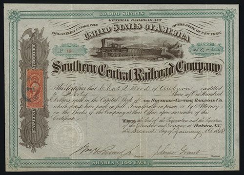 Auburn, NY. 1868. 40 Shares. Issued and uncancelled. Certificate #18. Locomotive coal train passes R-L Revenue stamp on left side. Light green border and brown text, title and vignette. Hatch & Co. XF condition. Rare and attractive railroad certificate. Catalogs in Cox for $400. Evidently rare.