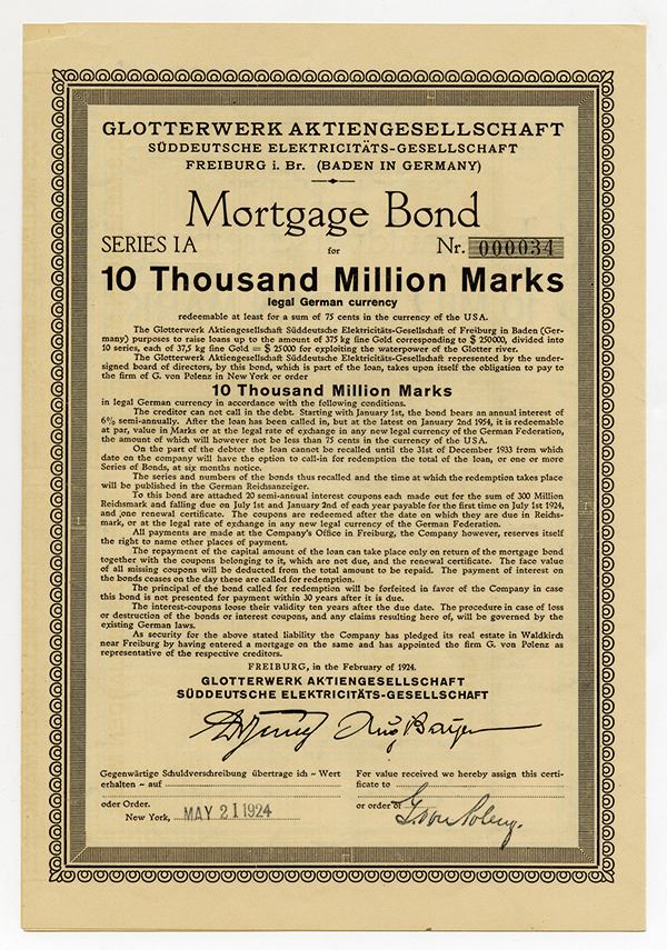 Baden, Germany. 10,000,000,000 Marks Issued 6% Mortgage Coupon Bond, Black print on black border printed in English and German, XF condition.