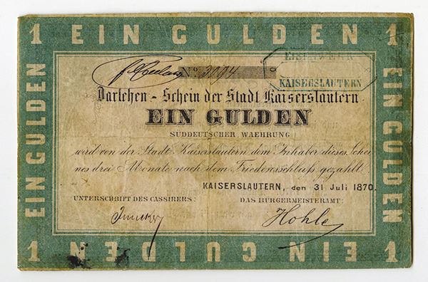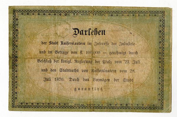 Kaiserslautern, Southern Germany. Issued 1 Gulden City Loan, 1870, unlisted in Pick, S/N 3094, Fine to VF. Highly unusual type. Black text with turquoise green border.