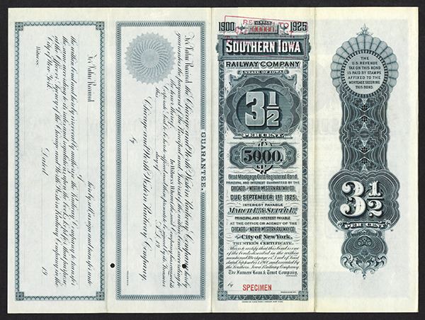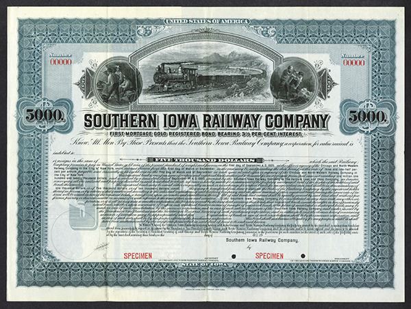 Iowa. Specimen bond. 1900. $5000. 1st Mortgage Registered 3 1/2% Gold Bond. Blue border and undertint. Long coal train R-L flanked by coal miners over title. No Coupons attached. XF condition. POC's. ABNC. Unlisted railroad in Cox. Rare railroad bond.