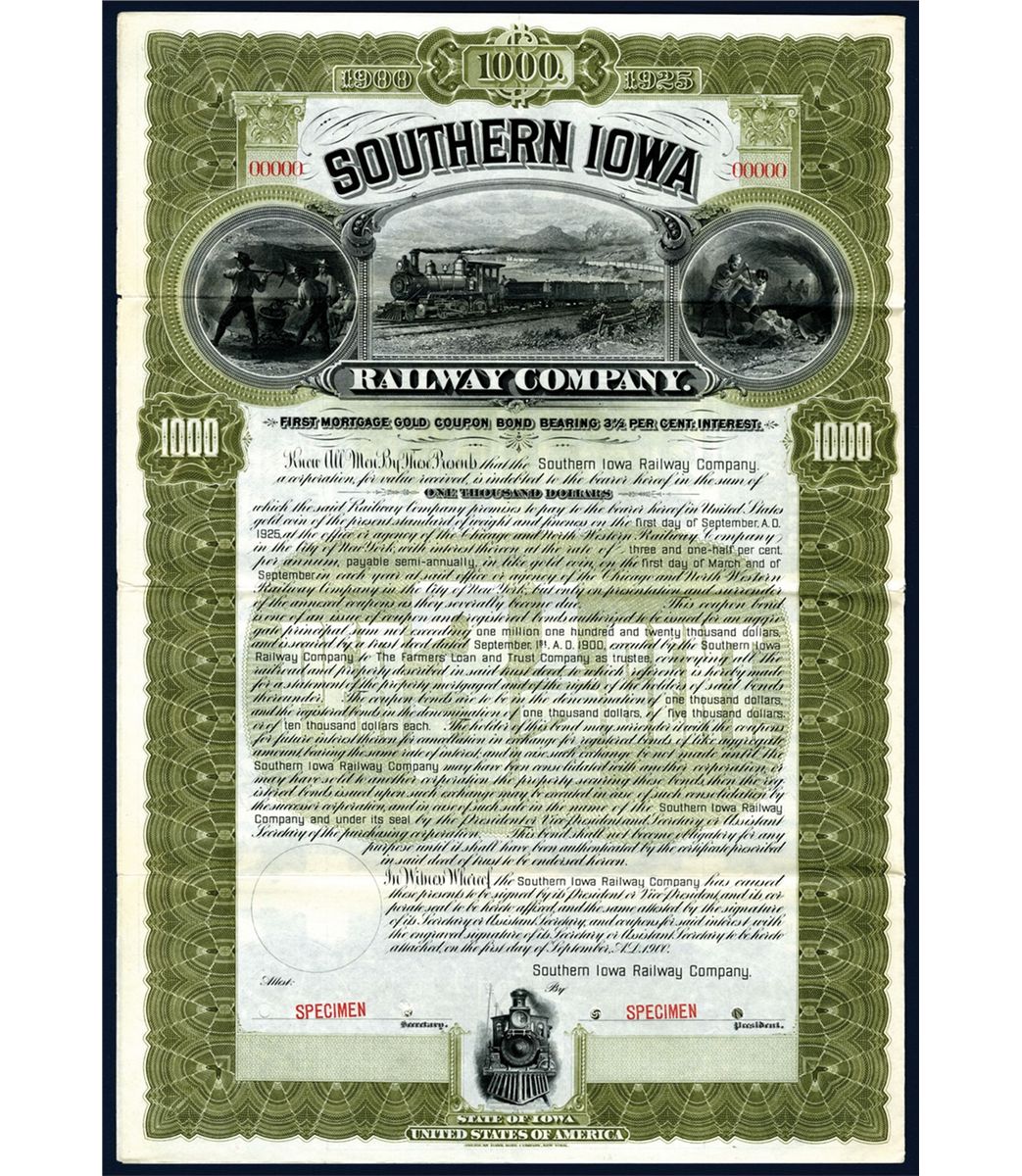 Iowa, 1900. $1000. 1st Mortgage 3 1/2% Gold Coupon Bond Specimen. Olive green border and undertint. Speeding locomotive right to left around long curved track flanked by miners working in mine, locomotive head on at bottom. VF condition. POC's. ABNC. Unlisted railroad in Cox. 1 of only 2 bonds found in the archives.