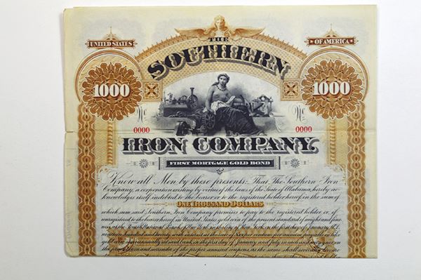Alabama. $1000 Gold Coupon Bond Specimen. Very Fine, light paper separation at fold ends.