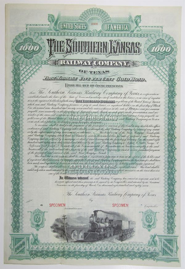 Texas, 1887. $1000 Specimen 5% First Mortgage Gold Coupon Bond, Black text with green border and undertint, Train passing over bridge depicted at center bottom. Red specimen overprints, 0000 serial number, and POCs. VF condition, ABNC. Only known as a specimen in Cox, no issued examples known.