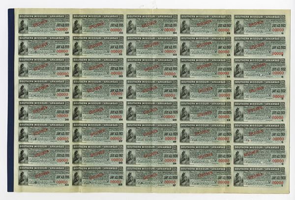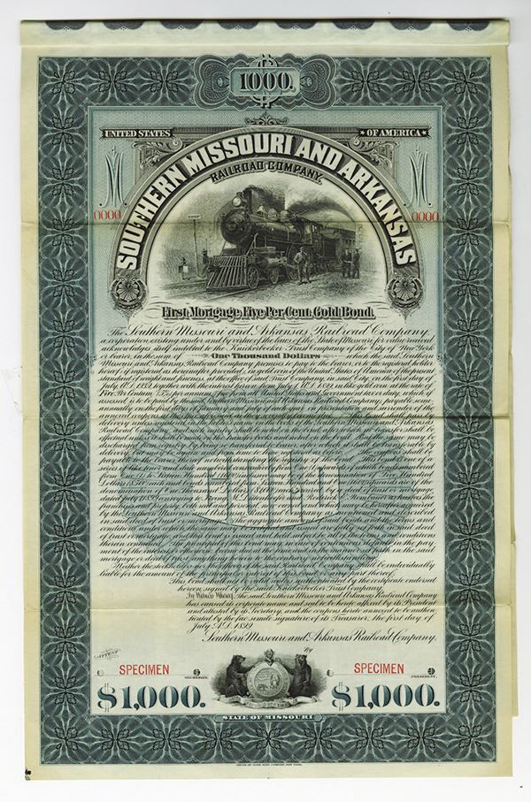 Missouri. $1000 1st Mortgage 5% Gold Coupon Bond, Specimen, Black on green border and under print, locomotive at station with worker standing next to it, Missouri Arms at bottom, Specimen overprints, POC's, VF. Rare and very attractive bond. ABNC. This was one of 2 examples found in the archives 13 years ago. It is named in Cox but no examples were available previous to this one.