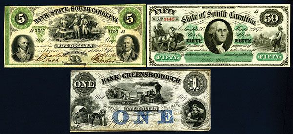 Lot of 3 notes, Includes 1858, Greensborough, Georgia, Bank of Greensborough, $1, Blue protector, locomotive in middle, XF-AU, BC&C-BBC; Charleston, S.C., Bank of the State of South Carolina, 1861, $5, VF to Choice VF with 2 small pin holes, ABNC; and Columbia, S.C., State of South Carolina, 1872 Revenue Bond Scrip, $50, Washington, Uncancelled, Uncirculated, ABNC. Attractive trio of notes.