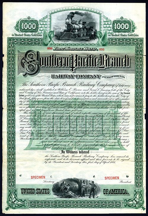 California, 1887, 6% 1st Mortgage Specimen Bond, Black on green border and underprint, Locomotive being loaded in front of lake, POC's red SPECIMEN overprints and red s/n “000 “, VF condition, ABNC. Unlisted railroad in Cox.