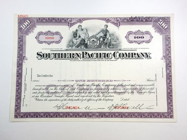 Kentucky. Southern Pacific Co, 1950s 100 Shrs Common Stock Specimen Certificate XF ABNC