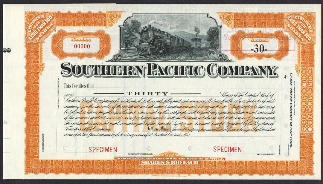 Kentucky, ND (1910-1930s). 30 Shares Specimen Capital Stock Certificate, Black text with orange border and underprint, Train approaching station while another departs at top center. Red specimen overprints, Issue Room stamp at top right corner, 00000 serial numbers, and POCs. VF condition, ABNC. Unlisted in Cox with 30 shares, Rare.