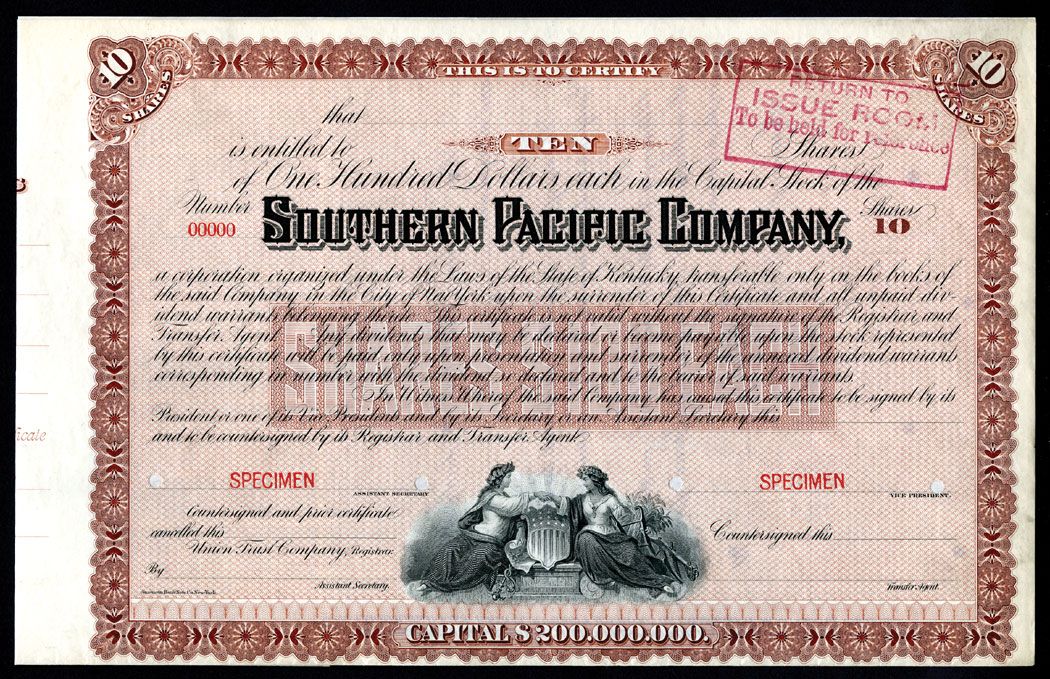 Kentucky, 10 Shares, Dividend Warrants attached, Specimen stock with dividend warrants. POC's. Allegorical women flank U.S.shield. Appears in VF condition. Rare certificate. Listed only as specimen. ABNC.
