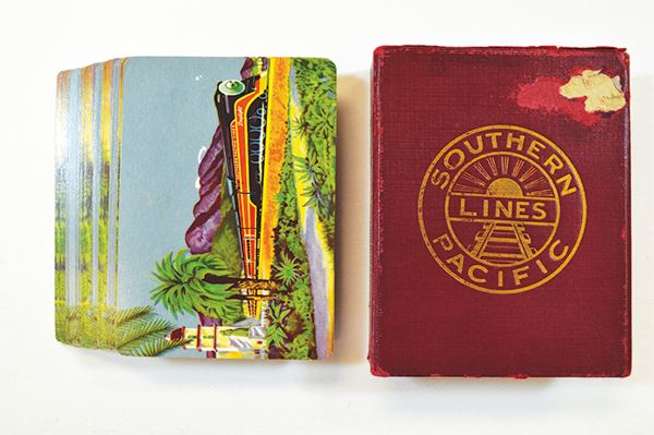 CA. Southern Pacific Lines. Playing Card features the Streamlined Daylong Locomotive, with different duo-tone views on each card. With Booklet explaining views. Also includes Joker, Salad Bowl ad and 1943 dated Bridge/trump card. Maroon slipcase and cover, damaged at top right.