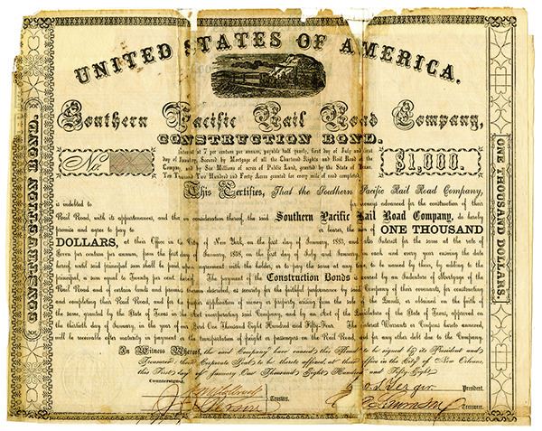 Texas. Shares Stock Issued Certificate, $1000, 7% coupon bond, Black print on black border on large sized certificate, Small image of locomotive under very large company title, Fine condition with repairs made down center fold lines and toning around margins. Open-cab loco and train l-r, horizontal format, construction, secured by mortgage, 7%, 25-yr, 1858, due 1883, this is the plate bond shown in Cox and may possibly be unique.