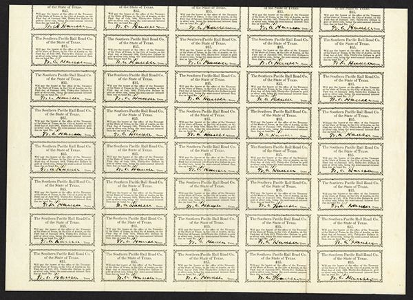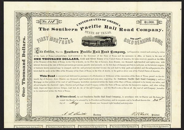 Texas, $1000, 1st Mortgage Gold Coupon Bond, I/U, Locomotive L-R on top, coupons attached, S/N 118. Rare and desirable. (ex-Smythe, 204 Strasburg Auction). (From a Texas Gentleman's Collection).