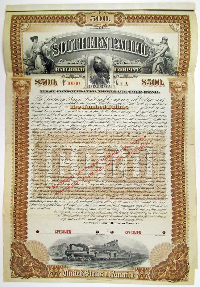 California, 1893. $500 Specimen 5% First Consolidated Mortgage Gold Coupon Bond, Black text with brown border and undertint, Eagle at top center with allegorical women at top left and right. Red specimen overprints, 00000 serial numbers, and POCs. VF condition.