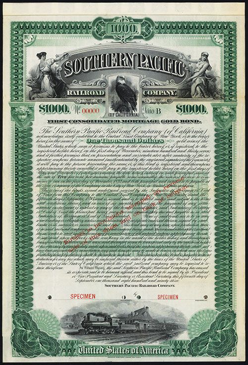 California, 1893, $1000. Series B, Specimen bond, 1st Consolidated Mortgage 5%, Gold bond, Black on green border and underprint, Allegorical women flanking ornate title with eagle beneath it and locomotive on bottom, coupons attached, POC's, Rare California railroad that is seldom seen.