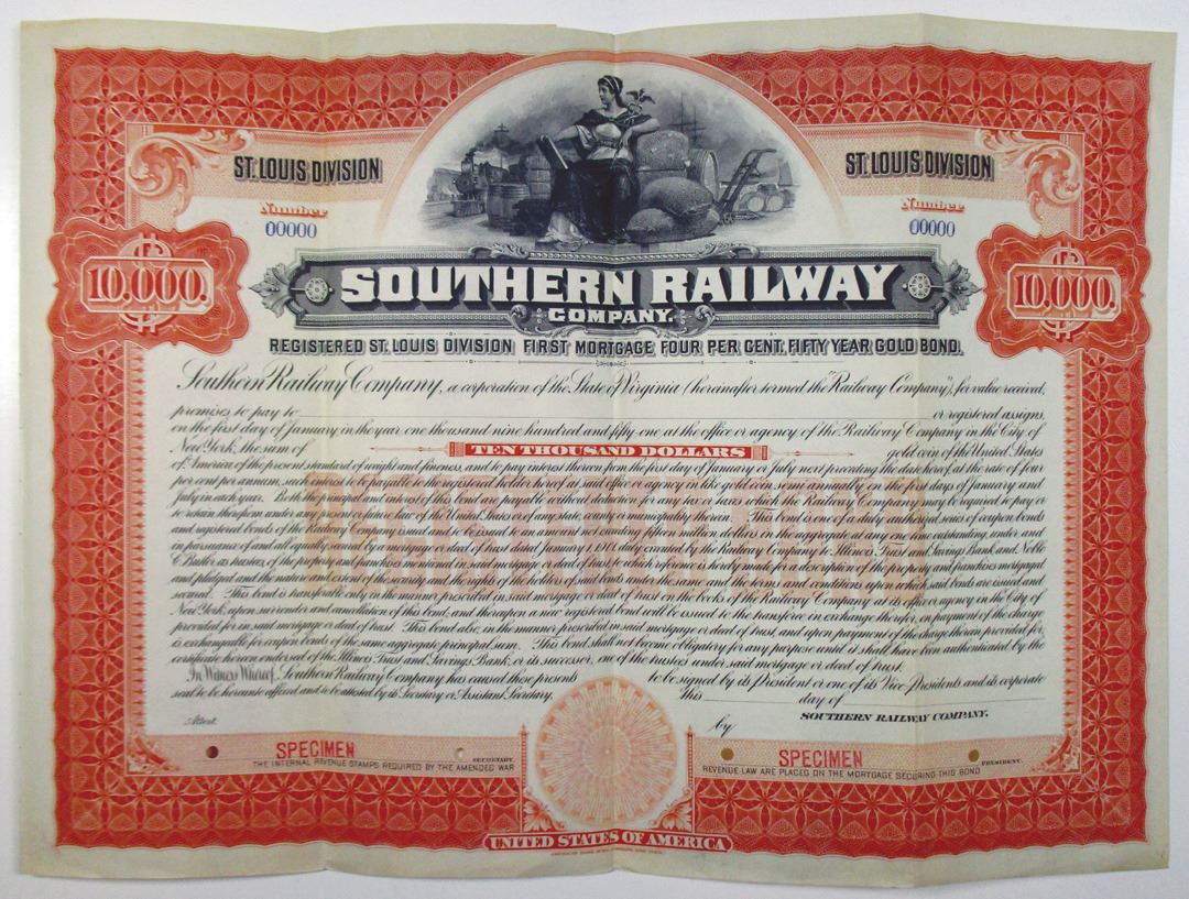 Virginia, 1901. $10,000 Specimen 4% Registered St. Louis Division First Mortgage Gold Bond, Black text with orange border and underprint, Allegorical woman seated among goods at top center. Red specimen overprints, 00000 serial numbers, and POCs. Fine-VF condition, ABNC. Rare specimen in Cox.