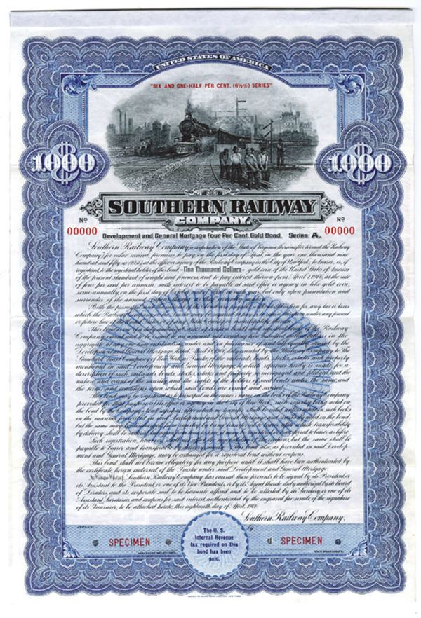 Virginia. $1000 Specimen 6 1/2% Development and General Mortgage Gold Coupon Bond, Black print on blue border and under tint, Locomotive passing men carrying rail road tie, Specimen overprints and POC's, VF-XF condition, ABNC.