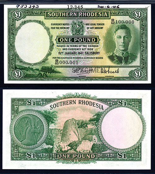 Salisbury, Southern Rhodesia, January 15, 1947, 1 Pound, P-10s, Unlisted Specimen banknote, King George VI on right, Pin punch SPECIMEN, S/N “B/60 000,001 - B/62 100,000 - 12345”, Archival notations on top margin including date 24-6-(19)46, Green on m/c on face, back green on pink, PMG graded Choice Uncirculated 64, attractive and high grade note for the issue.