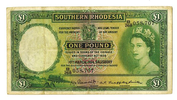 Southern Rhodesia, £1, P-13c, issued banknote, Green on m/c, Queen Elizabeth II at right, VF condition. BWC.