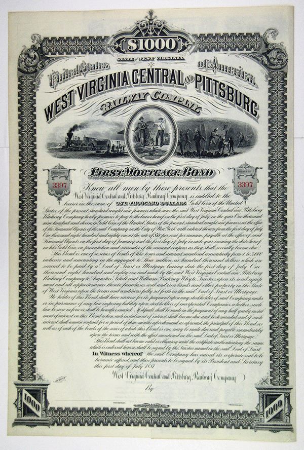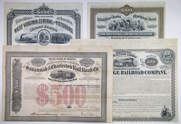 South Carolina, West Virginia, & Kentucky. Quartet of Issued Bonds. 1) Savannah & Charleston Rail Road Co., $500 8% Coupon Bond. 2) Blue Ridge Railroad Co., $1,000 or 200 Pounds Sterling 7% Coupon Bond. 3) West Virginia Central & Pittsburg Railway Co., $1,000 6% Par issued Coupon Bond. 4) Kentucky & South Atlantic Railway Co., $1,000 6% Coupon Bond #12. All bonds are in VF-XF condition. (4)