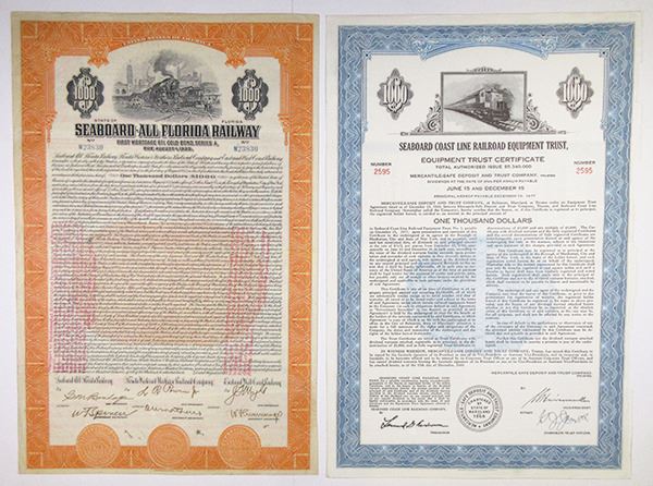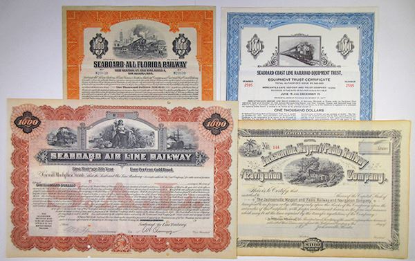 Florida, Virginia, & North Carolina. Lot of 4 certificates, Includes 1) Jacksonville, Mayport and Pablo Railway and Navigation Co., ca.1880s Capital Stock Par issued Certificate. 2) Seaboard Air Line Railway, ca.1930s $1,000 Par issued 4% Bond. 3) Seaboard-All Florida Railway, 1925 $1,000 Issued 6% Bond. 4) Seaboard Coast Line Railroad Equipment Trust, 1969 $1,000 Issued 8 5/8% Bond. All pieces range from Fine-XF condition. (4)
