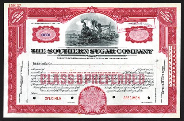 Florida. <100 Shares, Specimen, Black on red border and underprint, locomotive being loaded with sugar cane, VF-XF. Very possibly Cuba related. Scarce sugar company certificate.