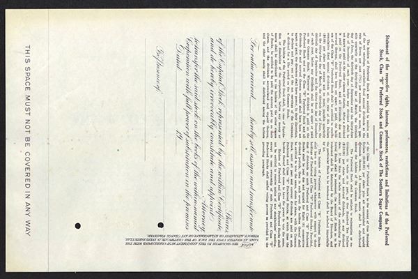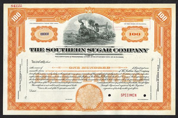 Florida. 100 Shares, Specimen, Black on orange border and underprint, locomotive being loaded with sugar cane, VF-XF. Very possibly Cuba related. Scarce sugar company certificate.