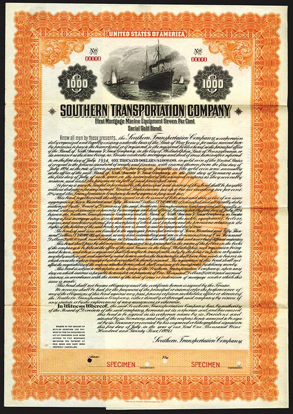 New Jersey, $1000, 1st Mortgage 7% Gold Coupon Bond, Steamship and sailboats at sea. Orange border. VF-XF condition. ABNC.