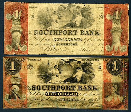 Southport, Connecticut. Lot of 2 notes, Includes $1, Plate D, Genuine and altered note comparison pair: * Genuine issued note. 1859. Plate D. Haxby CT-395 G2c. Rarity-6. Imprint of the American Bank Note Co. New-York. Red tinted ends with outlined numeral protector “1”s. Washington, LL; Martha Washington, LR and 3 allegorical figures on top middle, Genuine note, Choice Good to VG condition, with small body hole. Also included is an altered/spurious note, $1, May 1st, 1854. Plate C., CT-395-A10. Rarity-4. Imprint of Danforth, Wright & Co., New-York & Philad. Repaired on bottom margin. Scarce genuine note.