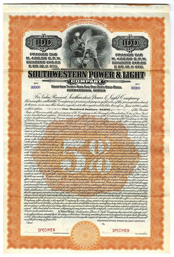 Maine. $100 - 518 Francs - Specimen 5% International Series 1st Lien Gold Coupon Bond, Black print on orange border and under tint, Allegorical figure at top with a torch, Specimen overprints and POC's, Fine-VF condition, ABNC.