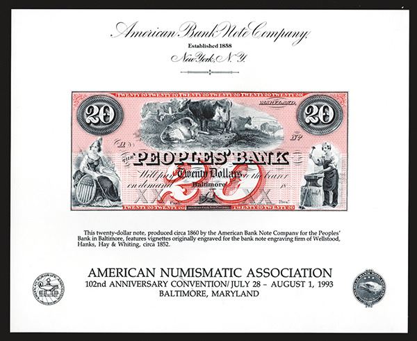 ABNC. Featuring Peoples' Bank, Baltimore, MD. 20 Dollar note. As made. 200 Pieces.