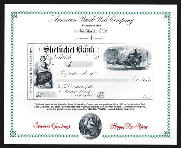 ABNC. Featuring Shetucket Bank of Norwich, CT. Check form featuring Santa Claus in sled. As made. 250 pieces.