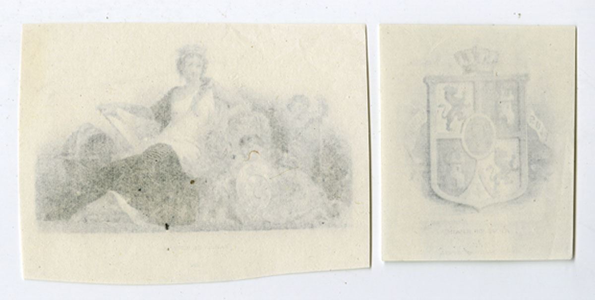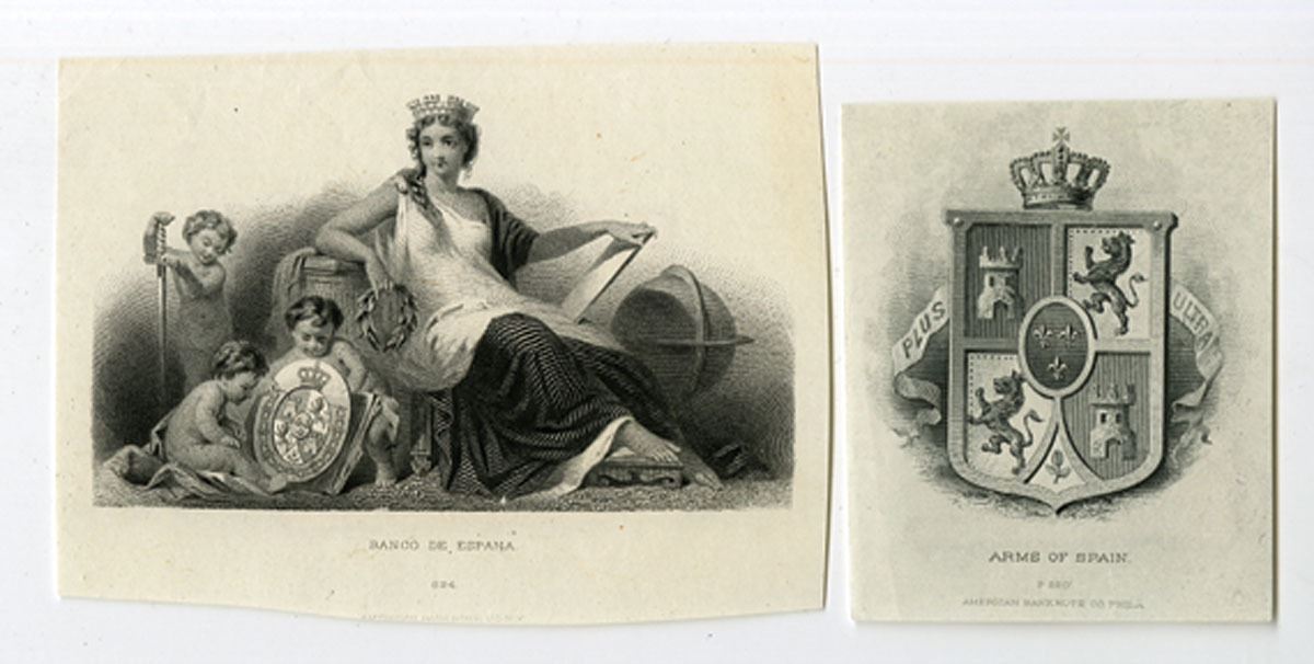 Spain, ND (CA.1876). Lot of 2 Proof Vignettes, ABNC Proof vignettes of reclining woman with children and Arms of Spain on left used on 500 Pesetas, Banco de Espana P-12, 3.75 x 2.75 and Arms of Spain 2 x 2.5. (2). Rare proof vignette pair printed on india paper. Uncirculated to CU condition. ABNC.